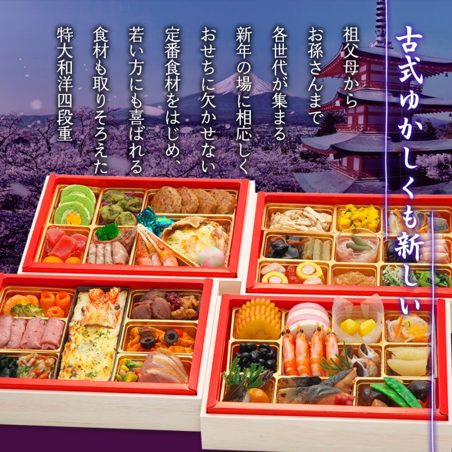 正月に、おじいちゃん・おばあちゃん・お孫さんたち、3世代大家族で楽しめる、ボリューム満点! 美味しさたっぷりの特大和洋おせちです。