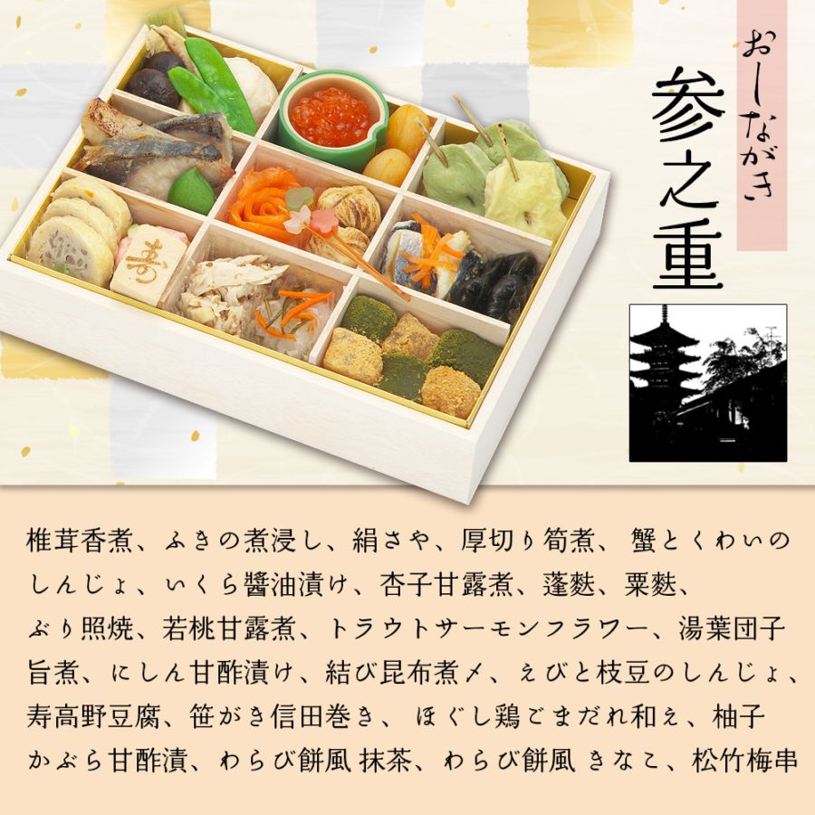 椎茸香煮 2個、ふきの煮びたし 2個、きぬさや 2枚、味付厚切り筍 2個、蟹とくわいのしんじょ 1個、いくら醤油漬 25g、杏子甘露煮 2個、蓬麩 2本、粟麩 1本、ぶりの照焼 3切、スモークサーモントラウト 1個、湯葉団子旨煮 2個、にしん甘酢漬 30g、結び昆布煮〆 2本、えびと枝豆のしんじょ 1個、寿高野豆腐 1個、笹がき信田巻 3枚、ほぐし蒸し鶏ごまだれ和え 40g、柚子かぶら甘酢漬 30g、わらび餅風 抹茶 3個、わらび餅風 きなこ 3個、松竹梅串 1本