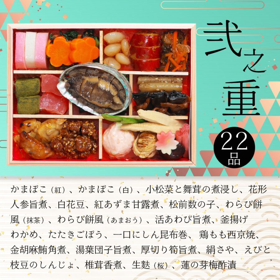 かまぼこ(紅) 2枚、かまぼこ(白) 1枚、小松菜と舞茸の煮浸し 20g、花形人参旨煮 2枚、白花豆 5個、紅あずま甘露煮 3個、松前数の子 20g、わらび餅風 抹茶 2個、わらび餅風 あまおう 2個、活アワビ旨煮 1個、釜揚げわかめ 20g、たたきごぼう 5本、一口にしん昆布巻 3個、鶏もも西京焼 3個、金胡麻鮪角煮 30g、湯葉団子旨煮 1個、厚切り筍旨煮 2個、きぬさや 2枚、えびと枝豆のしんじょ 1個、椎茸香煮 2個、生麩(桜) 1枚、蓮の芽梅酢漬 4本