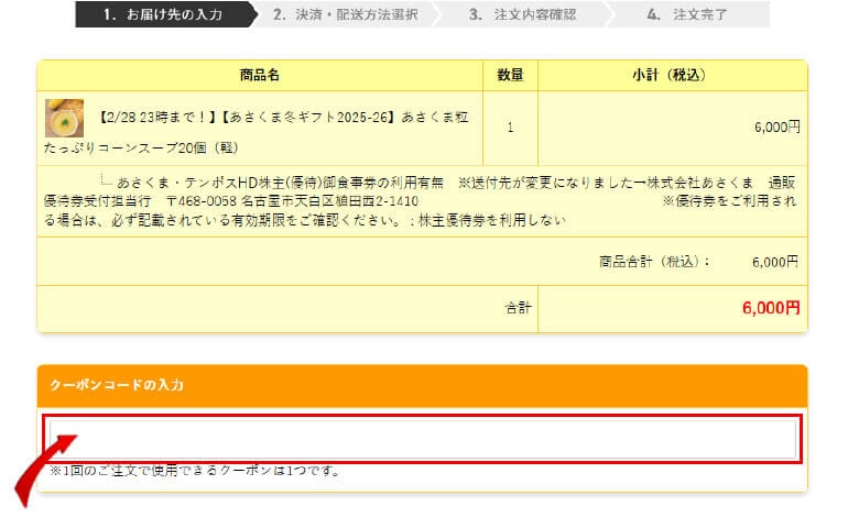 こちらに、当たりくじに掲載のクーポンコードを入力してください。